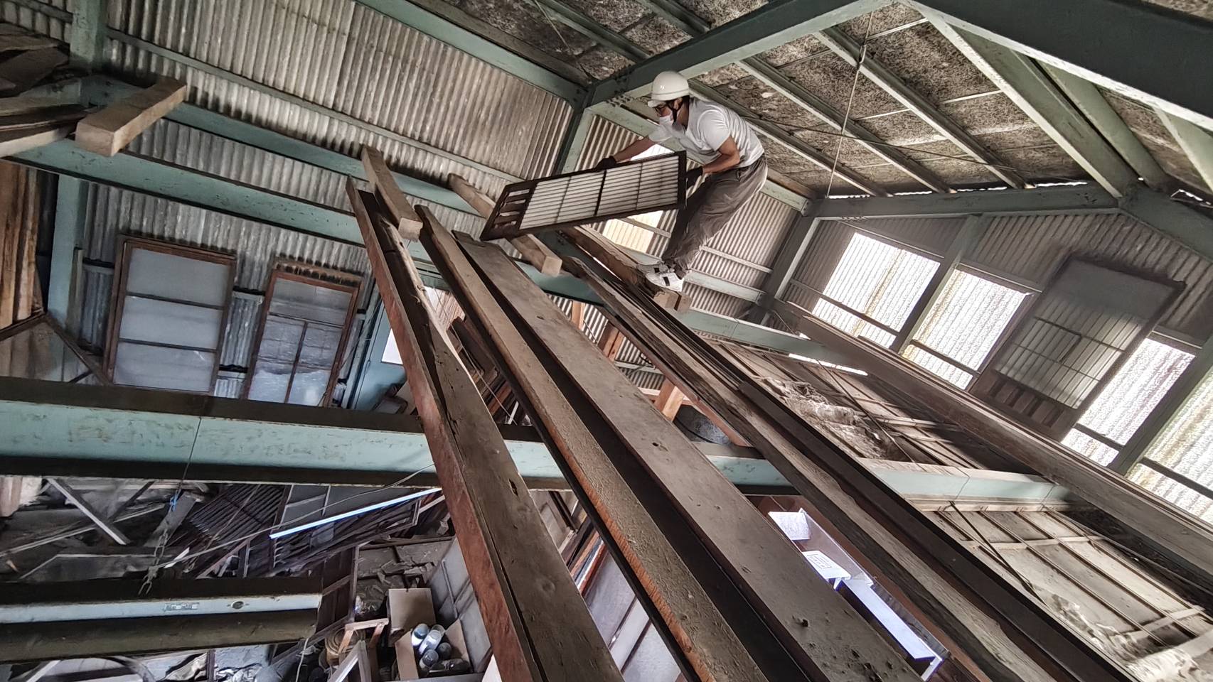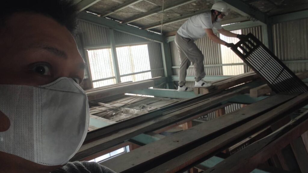 不用品回収業者スマイルノーツの川村様にもご協力、ご助言を頂き上からそーっと投げて落としていくしかないという結論に、